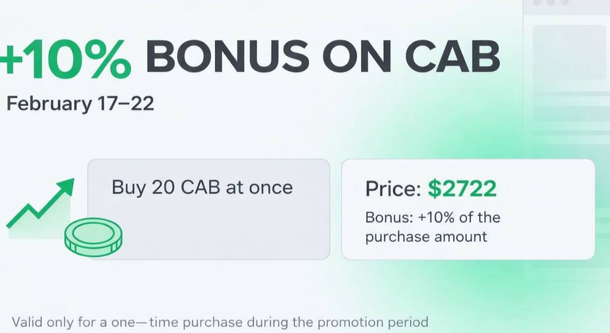 Invite a new Client who buys 20 CAB coins and receive a 10% referral bonus (3% according to the referral program rules, plus an additional 7%).
